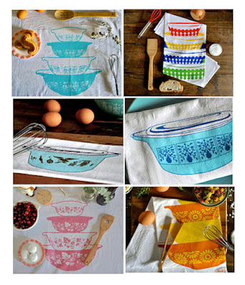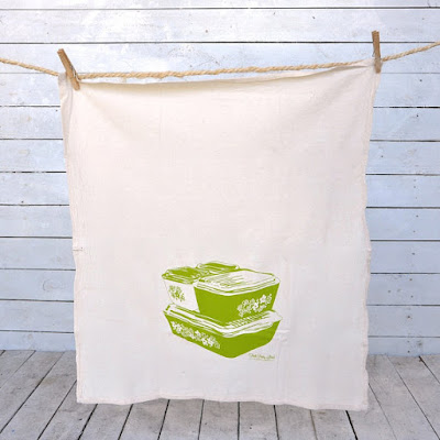 Imagine my excitement when I came across this wonderful Etsy shop! Deva of the Fresh Pastry Stand offers a wonderful collection of candles, aprons, and tea towels. Several of the tea towel designs feature Pyrex! Woo hoo!